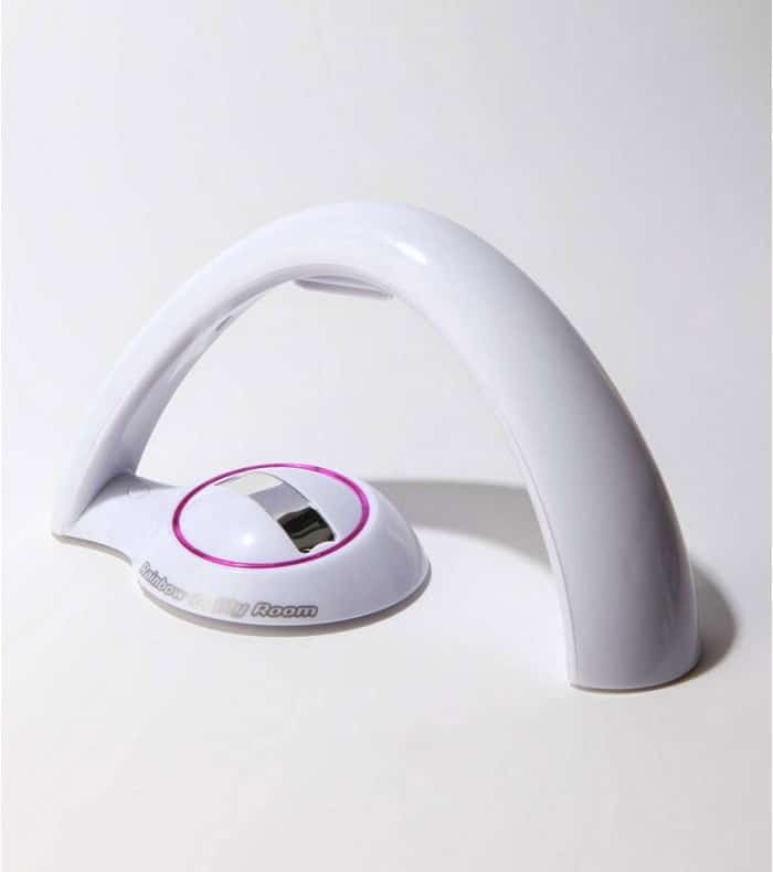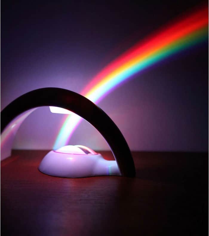 Vous avez bien lu, cette lampe au format étrange est bien un projecteur d’arc-en-ciel ! Doté d’une lampe LED, ce projecteur diffuse un magnifique arc-en-ciel sur les murs ou le plafond d’une pièce quand vous éteignez les autres lumières.